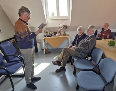 Na het officiële gedeelte werd hij, in Den Brommert, in het bijzijn van genodigden nog eens extra in het zonnetje gezet. Na een toespraak van Alie en nadat Meintje haar gedicht voorgelezen had, werd er getoast op de verdiensten van Arie Verhoeven.